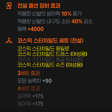 | 착용한 부위 방어력 10% 증가 착용한 부위 내구도 소비 40% 감소 각 매력 4000씩 증가 |