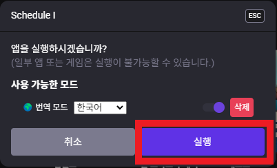 | 들어갔는데 한글화가 안돼요 | 게임 끄신 다음 OP.GG 프로그램에서 Schedule I 모드 삭제 후 게임 끈 상태에서 다시 설치하시고 실행하세요. |